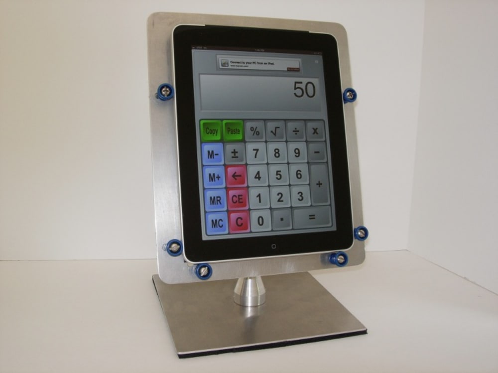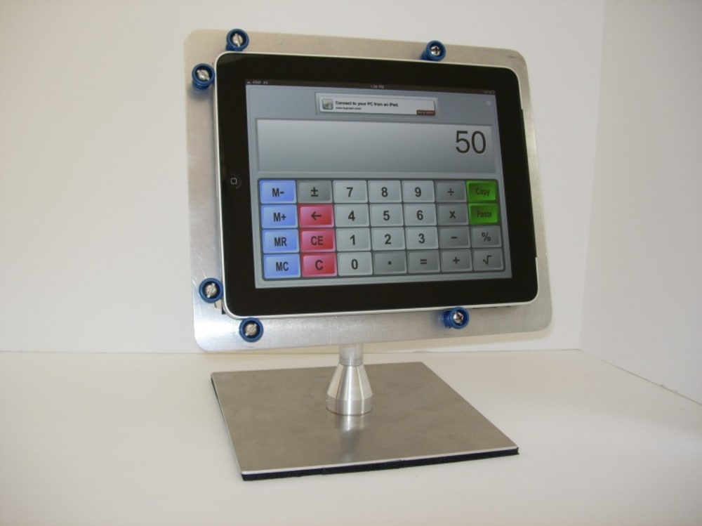 When I first saw the iPad, I immediately began thinking of how I could build a stand that is versatile and is easy to use. As the iPad has many applications, I envisioned the stand to have many applications. I have a stand design that can be used with tablets and ereaders, but I have based it on the Apple iPad and the Amazon Kindle. It will accommodate other models such as the new HP Touchpad. Additional accessories expand its use to increase its value. It comes in three sections: a top plate, a pivot head/pole mount, and a base with a cyclinder cone to hold the pole.