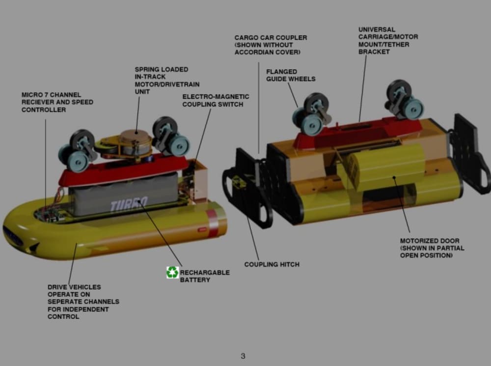 This model solves problems typical with electric model trains like dead zones in the track from bad electrical connections, or not being able to go full speed for fear of derailment. Both of these problems are eliminated with the tubular hollow track design. As the illustration shows, the train’s drive unit and carriages operate inside the tubular track since the track is a hollow extrusion. Thanks to an on board solar rechargeable battery in each drive unit, the use of electrical contacts in the track is eliminated.