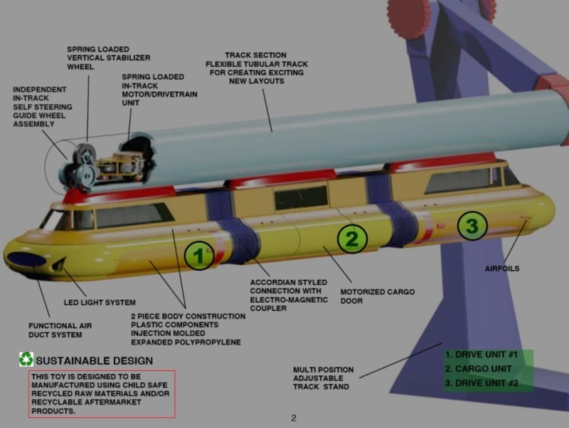 The model’s primary purposes are to eliminate some of the drawbacks of traditional electric train sets and to display the benefits of a suspended train system.