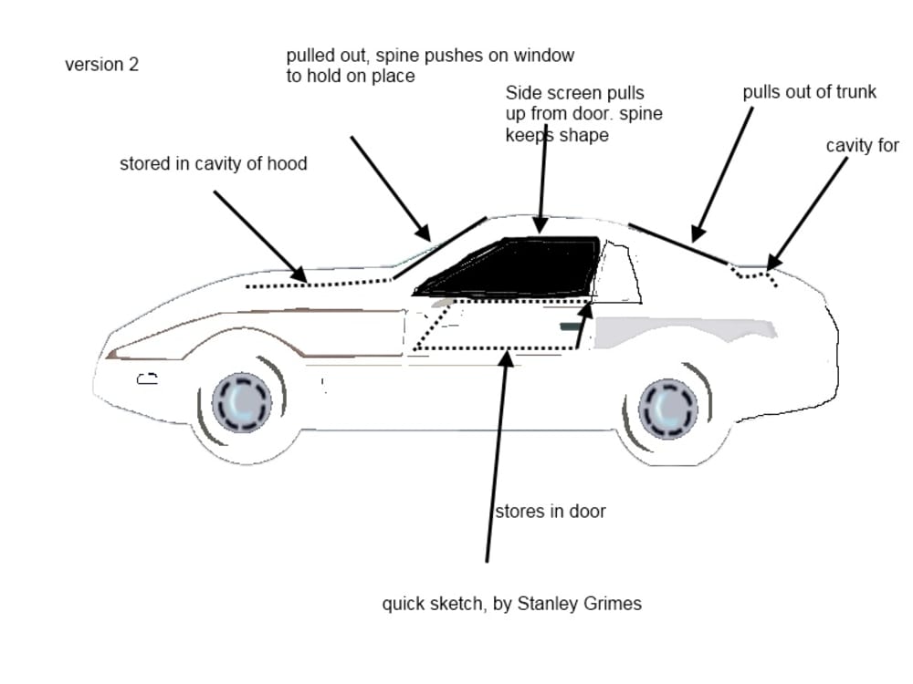 Version2. Manufacturers can embed a shade that can mechanically be pulled up from each window via, from under the hood, under the trunk and from each side window. The shade can have a wire or plastic frame to hold the shape.