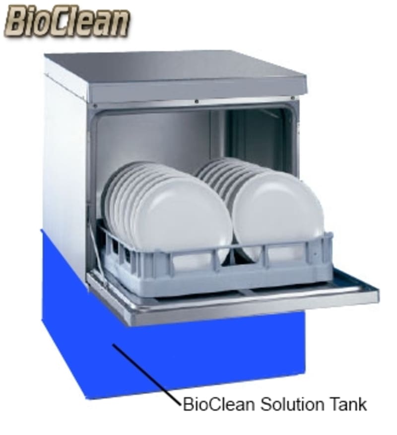 How does it work? The BioClean Dishwasher makes use of a proprietary blend of cellulase enzymes and bacteria complexes to completely dissolve food material, then rinses the dishes in superheated water for a clean, sterile finish. Simply by adding a fresh BioClean Tablet to the dishwasher each week, the consumer is assured that the dishwasher will provide a week's worth of clean dishes without sending any nasty soap residues down the drain. That's right, the BioClean Dishwasher uses NO SOAP!