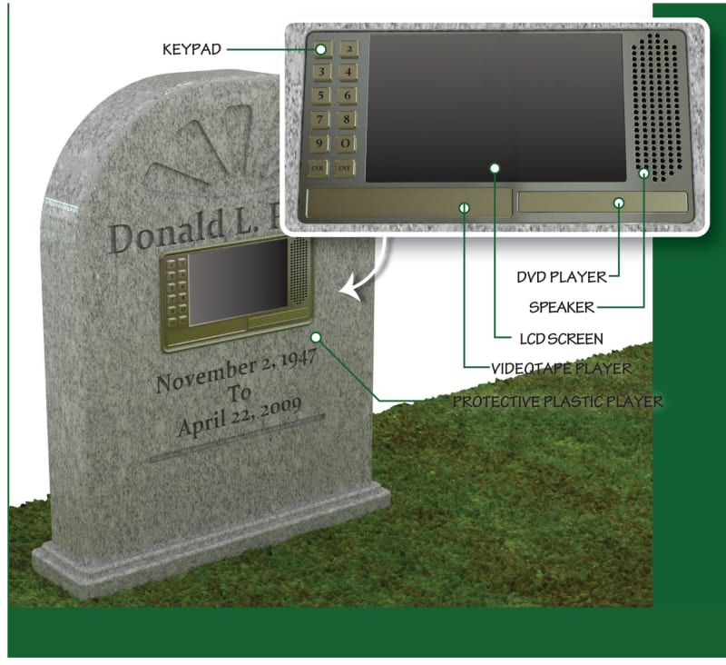 Recognizing the potential for a funerary product that would provide a more personalized means of celebrating the life of the departed, I have developed a unique product line designated as Everlasting Memories. Everlasting Memories is a line of monuments and grave markers configured specifically to provide a visual reminder, as well as an oral history, of the life of the departed. Manufactured from a variety of materials including bronze, steel, granite, and marble, these markers would be produced in a myriad of traditional headstone and grave marker shapes, including rectangular, square, ovoid, and obelisk. As with standard funerary markers, the Everlasting Memories would be engraved with the name of the deceased, the dates of their birth and death, and personalized inscriptions. Most notably, housed within would be a small video monitor, DVD or VHS video player, as well as a stereophonic speakers. Programmed to display photographs, voice recordings and video feed of the departed, the devices would be protected from the elements via a heavy duty Plexiglas or plastic covering which encompasses the front of each marker. Further, these devices could be accessed for the purposes of repair or general upkeep via a small, locked door or similar covering positioned on the side or bottom of the unit. I have also designated that the Everlasting Memories monuments could feature holographic projections. Holographic projections are basically a 3D (three dimensional image ) projected as to appear to be floating in space. A simple and elegant imaging medium, holographic displays are designed to relay a full color moving image projected by standard video projectors. The Everlasting Memories video monitor , DVD or VHS player and stereophonic speakers would be activated via a simple enumerated , push button keypad located on the front of marker. This keypad could be programmed with several pass codes in order to provide access to the Everlasting Memories displays by various family members and friends, could be powered by conventional 100 volts, 60 hertz power or solar powered to a battery.