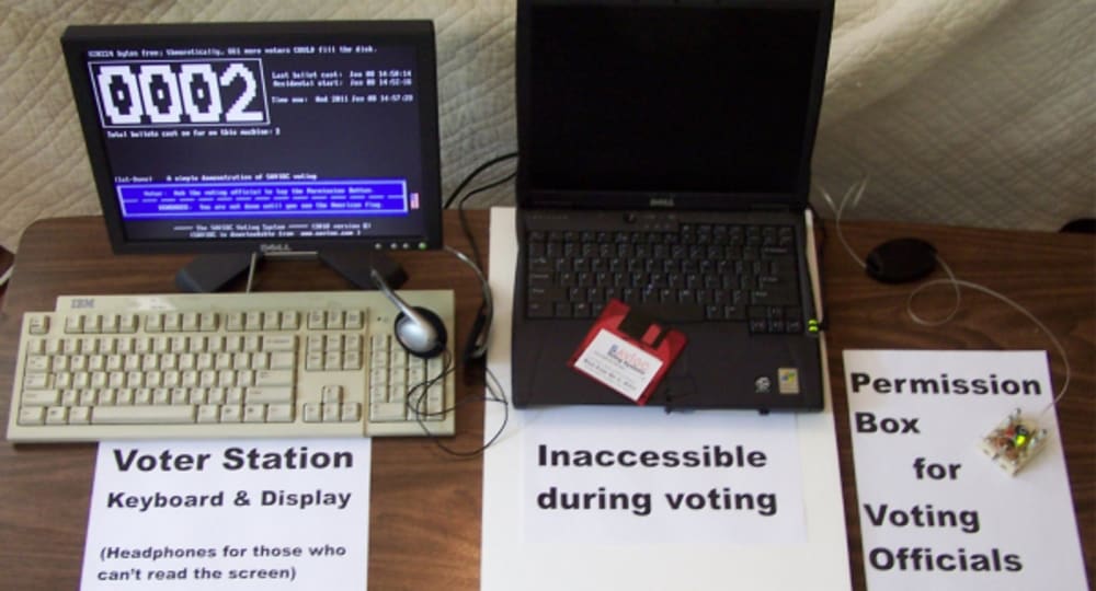 Because all software, including the operating system, is on a floppy, the hard drive (if any) is irrelevant. An image of each precinct's boot diskette is made public before the election, and multiple copies are provided to the precinct. On election day, one copy is selected by a clearly random process to boot the computer, and others are distributed to interested parties for verification. This prevents pre-election chicanery. Once the program is started, it cannot be interrupted except by removing power or ejecting the diskette. Furthermore, an unlimited number of provably identical copies of the final results can be generated and distributed to multiple parties to keep each other honest. (Other voting systems have only one master copy of results; whoever controls the results could control the election.) SAVIOC requires no keylocks, secret passwords or "trusted operators" with special access to the system!