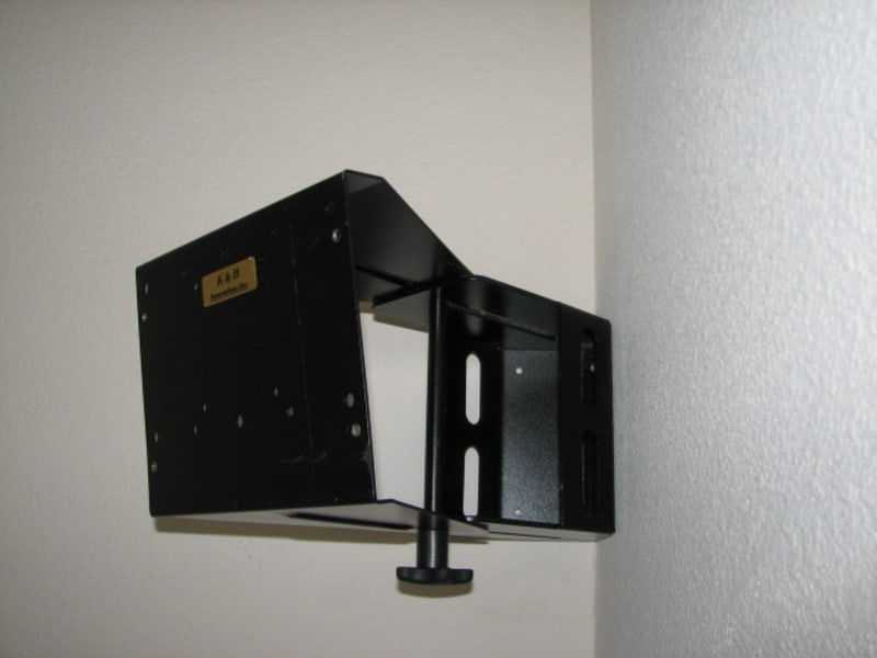 Patented three piece bracket system used for hanging flat screen televisions and computer monitors in the corner of any room. Simple design makes for much faster and easier assembly than anything else currently on the market. Made of lightweight steel, the brackets may also be manufactured using an injection molding technique. The bracket is comprised of three pieces: a corner mount, a faceplate, and a slide pin. The corner mount is secured in the corner with drywall anchors and screws. The faceplate has VESA standard bolt pattern (fitting up to 23" screens) and is secured to the screen or monitor. The faceplate and corner mount are held together by the slide pin. An additional attrractive feature is an optional lock that may be used as a theft deterrant.