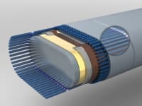 Figure 1: Basic wire structure. A springy flattened microtube with joined layers of tempered beryllium copper and aluminum alloy chemically isolate sodium while increasing wire tensile strength to 1/3rd that of conductively equivalent copper. Insulation reinforcement adds more strength if needed. Insulation microchannels contain fire-extinguishing electrically insulative liquid. Transverse metal bulkheads microencapsulate sodium.