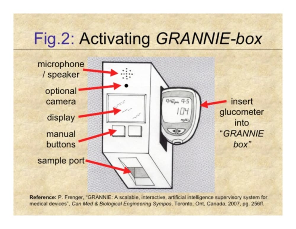 How does the G-box do this? It improves the glucometer interface: its touch-sensitive color LCD display has an unambiguous layout; it presses the glucometer buttons for you; and it works in several languages via its speech recognition / voice synthesizer. It extends glucometer functionality by improved handling and transmittal of data to health professionals, giving progress reports to patients, and providing alarms for abnormal glucose levels. Additional amenities include an onboard user manual and maintenance reminder. The most novel feature of the G-box is its AI: a realistic human-like personality and emotion processing, the GRANNIE who inspires patient trust, emotional bonding and cooperation.