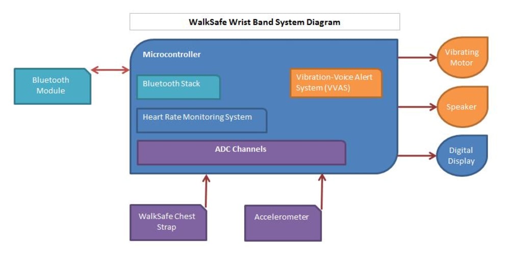 WalkSafe implements four main features; proximity sensor, vital statistics sensor, an accelerometer and a Vibration-Voice Alert System. Similar products are already available in the market, however the two main differentiating features are the accelerometer and Vibration-Voice Alert Alarm.