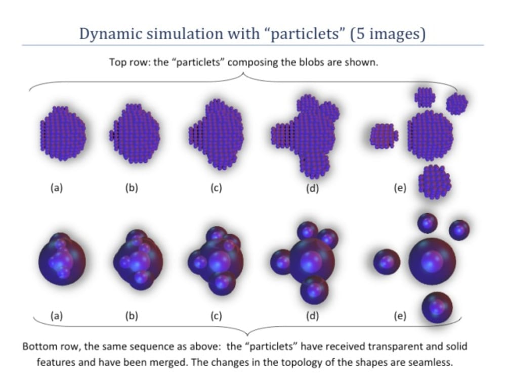 3) Exhibits on the fly approach for merging “particles”, enabling solid objects to become fluid and morph into any other shape in real-time.