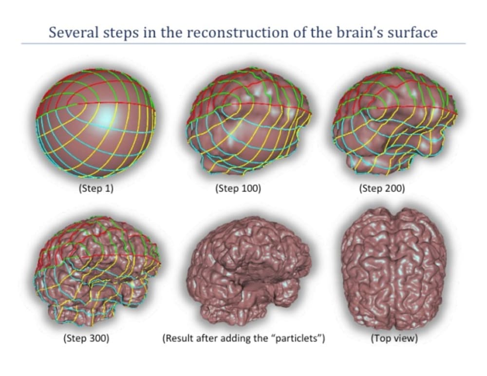Fig. 3: Five frames of a dynamic process for reconstructing the brain’s surface using a grid convergence approach. Once the convergence is complete a “particlet” is inserted at each grid point. Further, the inside of the reconstructed brain can be filled with “particlets”.