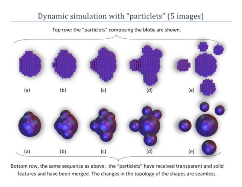 2) Uses "particlets" as building blocks for constructing 3D objects. Every “particlet” may carry surface and volumetric properties, similar to a cell in a living organism.