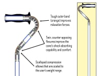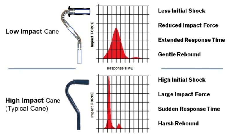 1) Reduce impact forces transmitted by the cane's handle upon the ground.