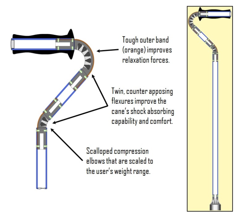 The many positive benefits from the Low Impact Cane, accomplished with the introduction of scaled flexures, scalloped in shape, utilizing a counter apposing design to preserve the linear alignment of the impacting forces and cane itself. The fixed scaling of the shock absorbing flexures allowing for more appropriate response characteristics to compression and relaxation forces. Thus, matching the cane's response function to the user's body mass. The Low Impact Cane performing the following: