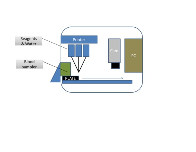The Diagnostic Kiosk uses a diagnostic plate preloaded with illness specific reagents, which can be processed and read automatically. The patient has a blood sample taken by the kiosk, using a diabetes meter type built in to the plate, which is then developed with appropriate chemicals, and next inspected using a built in computer vision system, all in approximately 4 minutes The end result is a recommendation printed out.