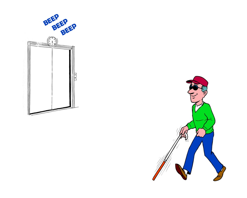Small radio receivers are mounted over or near the location or entrances of Restrooms, Elevators, Emergency Exits, Etc. These small receivers, each having their own specified frequency when triggered, emit a unique, but not offensive tone that can be heard for a distance of up to 50 feet.