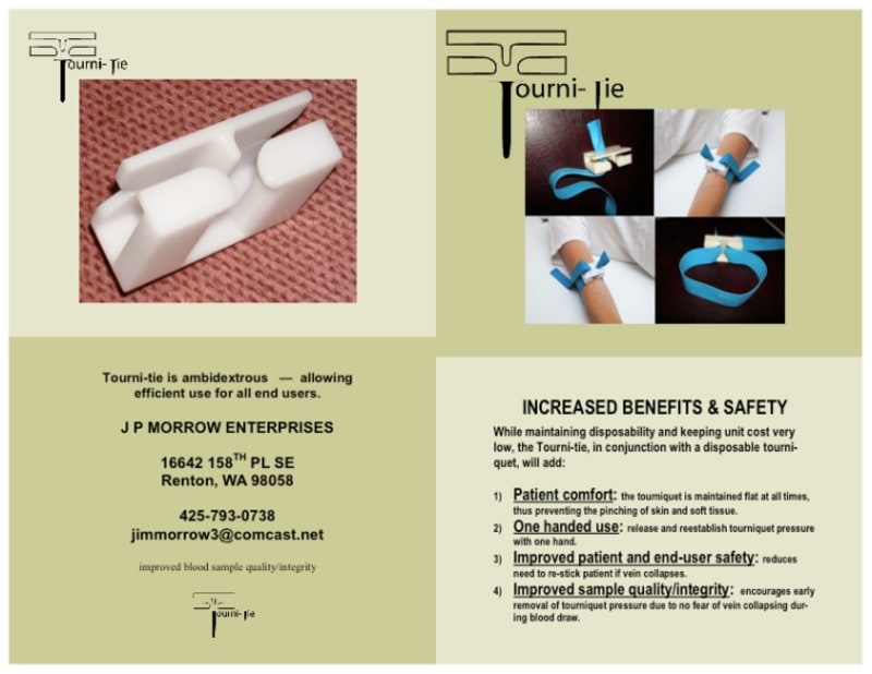 The Tourniquet Coupling Device eliminates these problems by first allowing the tourniquet to remain flat at all times during application with no pinching of the surrounding tissues. Second, upon application, one-hand operation allows for numerous applications of tourniquet pressure during the blood draw, eliminating the need to withdraw needle, reapply tourniquet and re-stick patient if the vein collapses after tourniquet pressure has been removed during the blood draw. Further, due to the device’s low cost and some procedural requirements for noninvasive medical devices, the device is disposable, minimizing the spread of disease. Also, the built-in quick release catch-design provides instant removal upon completion of the blood draw, further improving patient comfort and end-user safety.