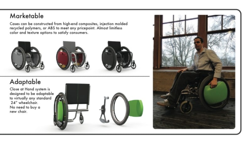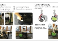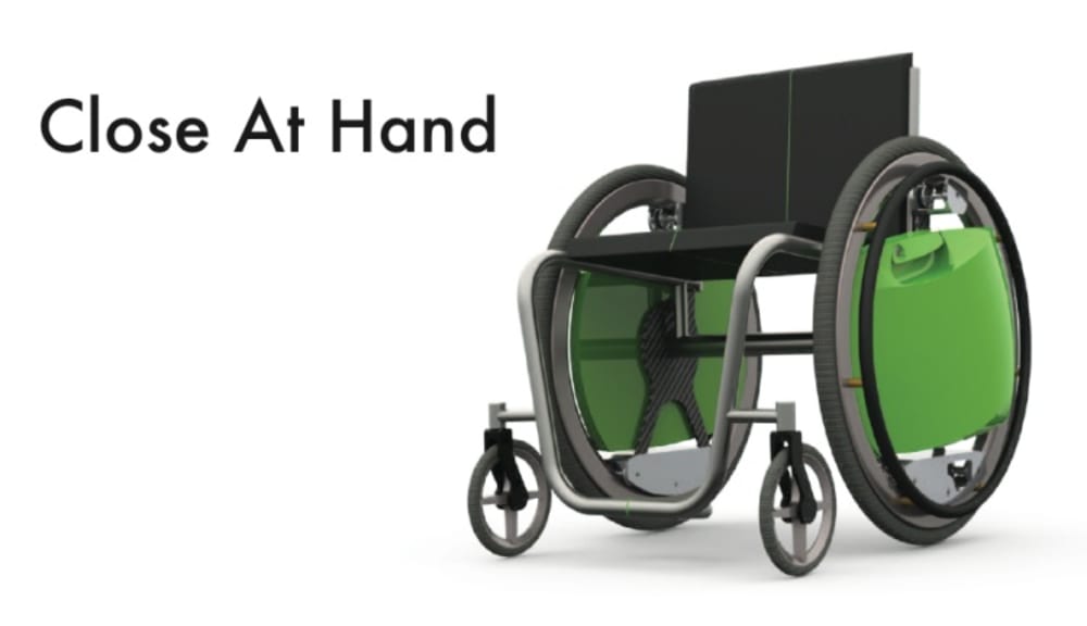 My Close at Hand concept seamlessly integrates the things we all choose to carry into the lives of those with limited mobility. The system consists of two lockable, waterproof hard cases that reside within the wheel area of the chair, requiring a 'hubless' wheel. Hubless wheels have been developed for recreational use and are suitable for human powered devices. The concept starts with a series of small rollers on which the rim and wheel rotate, allowing the case to remain upright while the wheel and handrim rotate around it. These rollers are attached to a frame that locates the wheel on whichever conveyance is being developed. The hard cases attach to the frame of the wheel system using lockable and quick release mounts similar to what you find on motorcycle luggage making the cases very easy to remove. Each case can be locked onto the mount as well as locked closed providing the most security possible. Both functions are performed with a single key and with one lock per case to add convenience and lower complexity. Much consideration has been given to the shape of the cases as they allow full access to the handrim for proper control and propulsion of the wheelchair by the user. Each case has interior pockets to securely carry many common items.
