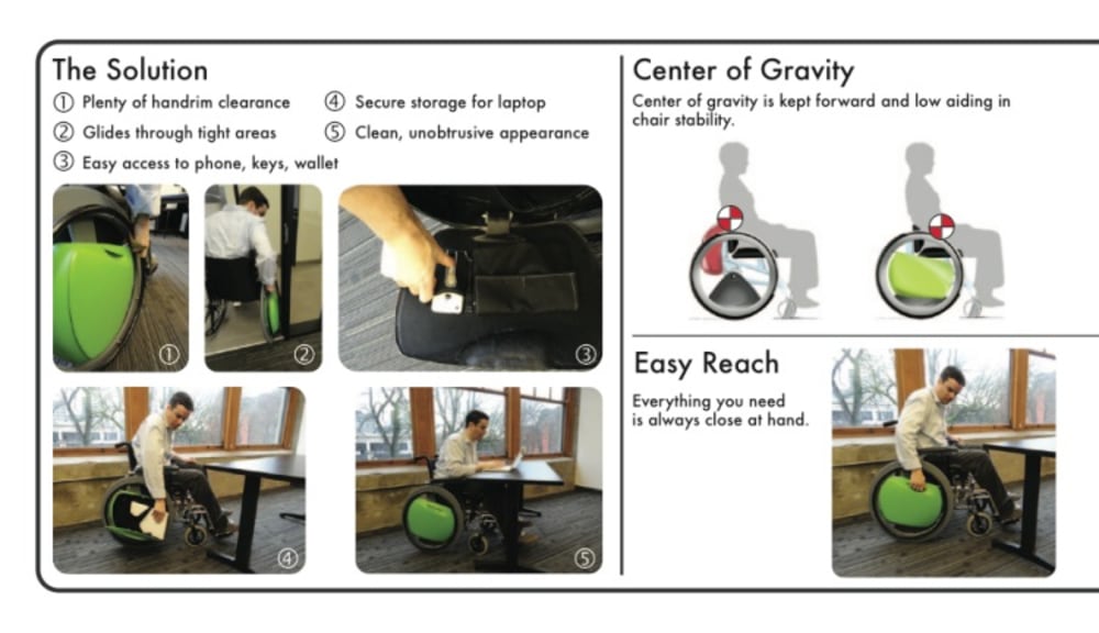 Consideration for how an individual carries all of the things that able bodied people take for granted: cell phones, computers, cameras, keys, and wallets/purses, has been confined to 'accessory' products. Many wheelchair users choose to carry less or are forced to use awkward, or even dangerous, solutions such as backpacks to carry their items. Backpacks require strenuous and uncomfortable twist and reach movements in order to access its contents. They can also move the center of gravity of the chair up and to the rear creating stability problems when negotiating inclines or off-camber situations such as cross walk ramps. Backpacks also lack security for their contents while residing in the most out of sight location possible...behind your back!