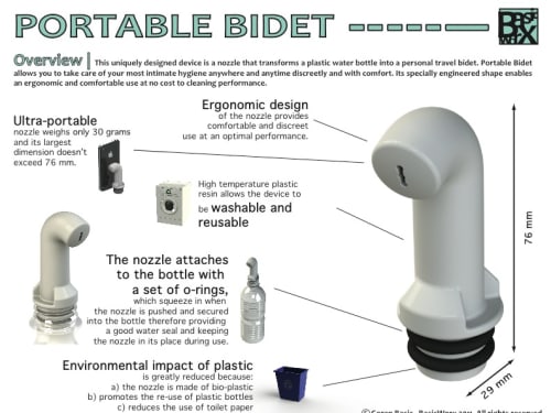 Portable bidet is a small nozzle that attaches to a plastic bottle and transforms it to a fully functional, personal bidet. The nozzle provides a convenient and time-saving alternative to the exclusive use of toilet paper, cumbersome and expensive bidets, a watering canteen or showering after using the washroom.