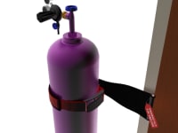 High pressure gas cylinders must by law at all times be secured by strap or chain to prevent them from falling over and breaking the valves and becoming deadly missiles. There are many acceptable methods from a simple chain or rope tied to a bolt on a cabinet to more complex strapped systems that allow the movement of the device to tables and benches.