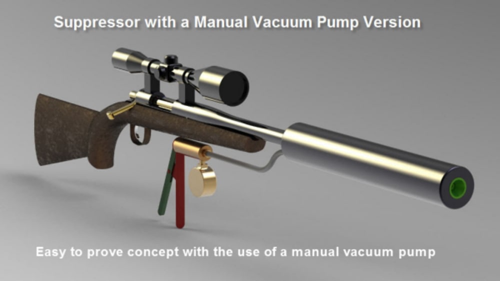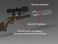 With the Vacuum/Suppressor in place, the pressurized gas behind the bullet has a vacuum chamber space to expand into, so the pressure of the gas that exits the tip of the suppressor is reduced significantly; therefore, the sound of the gun firing is more silent than conventional silencers.