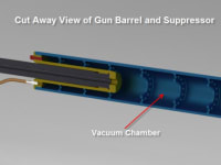 When the firearm is discharged the bullet travels through the barrel followed by high pressure gases. Once the bullet reaches the interior chamber of the suppressor, the gases will start to fill the vacuum chamber instead of finding a volume of air at normal atmospheric pressure level. As the bullet continues its travel through the distal end of the suppressor, it will perforate the vacuum seal and continue its flight path.