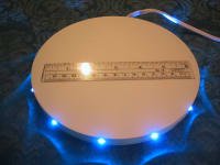 Light emitting diodes mounted on the outer edge of this thin disk provide the light at night. The cost for electricity is in the order of $1.45 per year. There are no plug-in wall transformers. The efficient power supply is self contained. The lamp is always cool. Expected life time for the LEDs is over ten years.