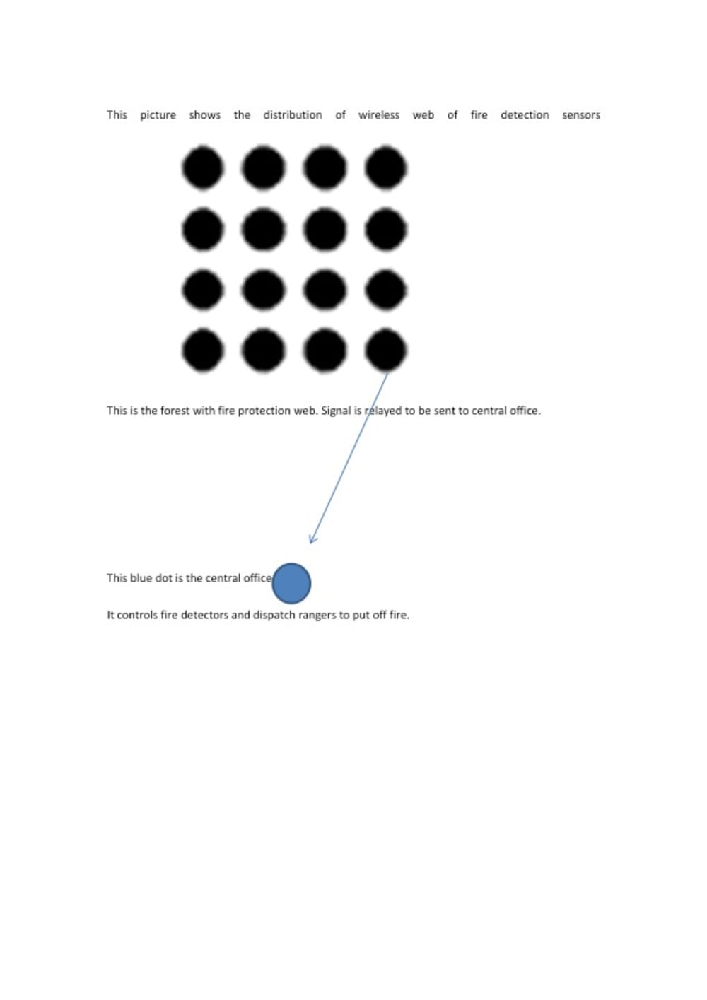 A wireless system that monitors forest fire that sends signal to the fire station and control center.