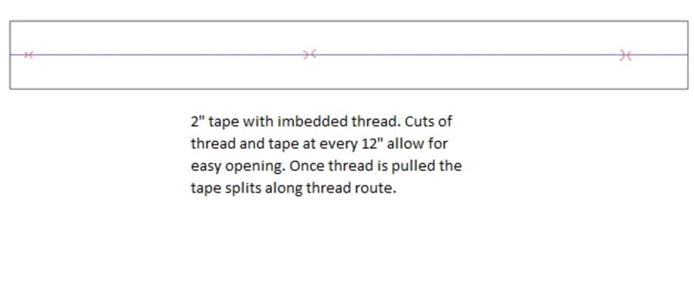 Safety tape is standard clear packing tape with a thread imbedded in the center of the tape strip along the length of the tape. At every 12 inches there are 2 cuts in the tape and thread in a half circles. This circle allows for a finger nail or other object to grasp the tape and thread and pull. Once the thread is pulled it will split the tape allowing for easy opening of the box. Thread can be cotton, nylon or an increase in the thickness of the tape. The thread path may or may not have adhesive applied.