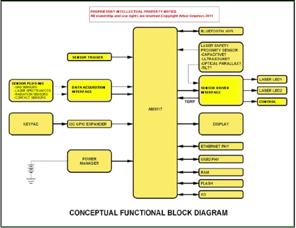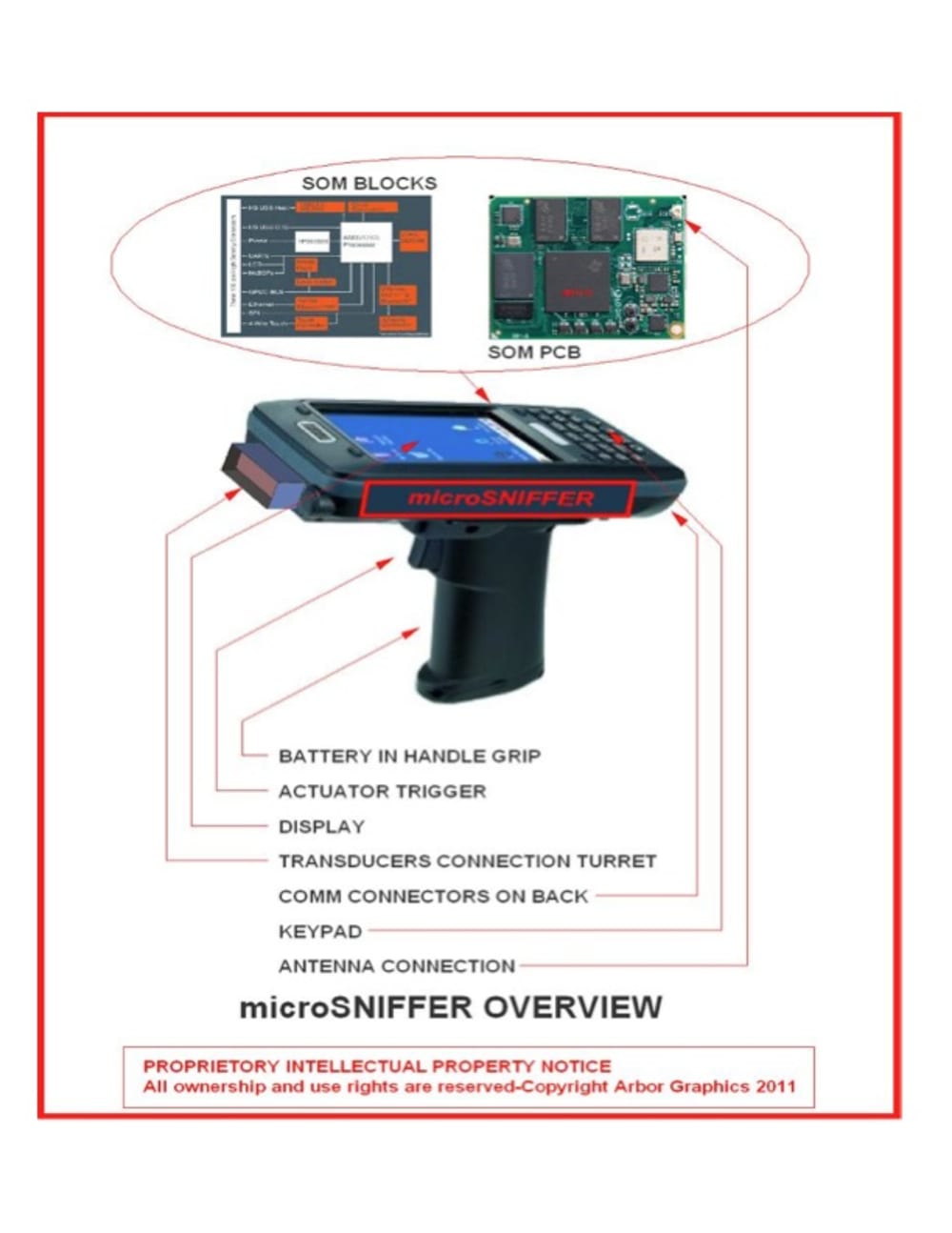 The heart of the microSNIFFER is the Texas Instruments TI-AM3517 processor with ARM Cortex-A8 core. Also, internal peripheral capabilities such as the serial ports and the onboard radio transceiver allow for significant savings in external parts and printed circuit real estate. The output block comprises the display and audio annunciators (plus their driver transistors) along with a small antenna sub-system.