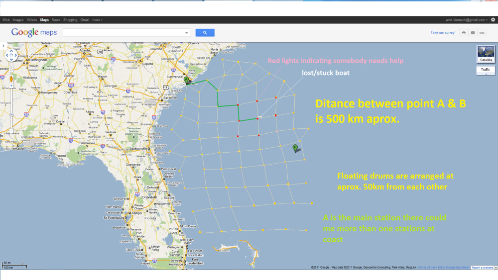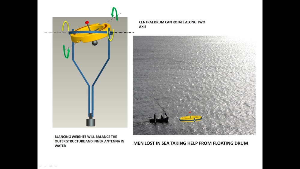 The idea is to have multiple floating drums in sea, communicating with each other and helping lost/stuck people. The drums will have electronic circuits (transmitters and receivers) to send and receive wireless signals from other floating drum circuits. Each drum will have a waterproof keypad to type a message and send to the coast or nearby ships. Every drum will try to communicate with nearest drums in all directions (like a web) and will take the shortest path to the coast.