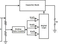 This voltage is converted into a low voltage of around 1V (maximum) by resistor divider. This low voltage is fed to a comparator bank through an analog optocoupler. Depending on the voltage received, some comparator output remains high. Depending on the comparator output digital logic switches capacitors in the capacitor bank. Thus we maintain some constant voltage irrespective of the fluctuations. This voltage can be stored in a battery which can be used for lighting. The scheme is shown in figure2.