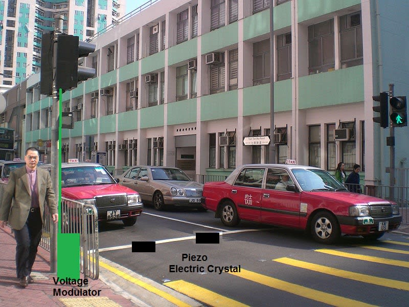 In this work we place the piezo electric crystals at the traffic line as shown in figure 1 marked by black boxes. Whenever a vehicle crosses the line, it produces a voltage which can be stored for future use. However it must be noted that most of the voltage is obtained when the vehicle comes to rest on it. The kinetic energy goes to zero in a very short period time. The voltage obtained by quartz crystal is assumed to vary, say from 0 to 100V depending on the force applied.