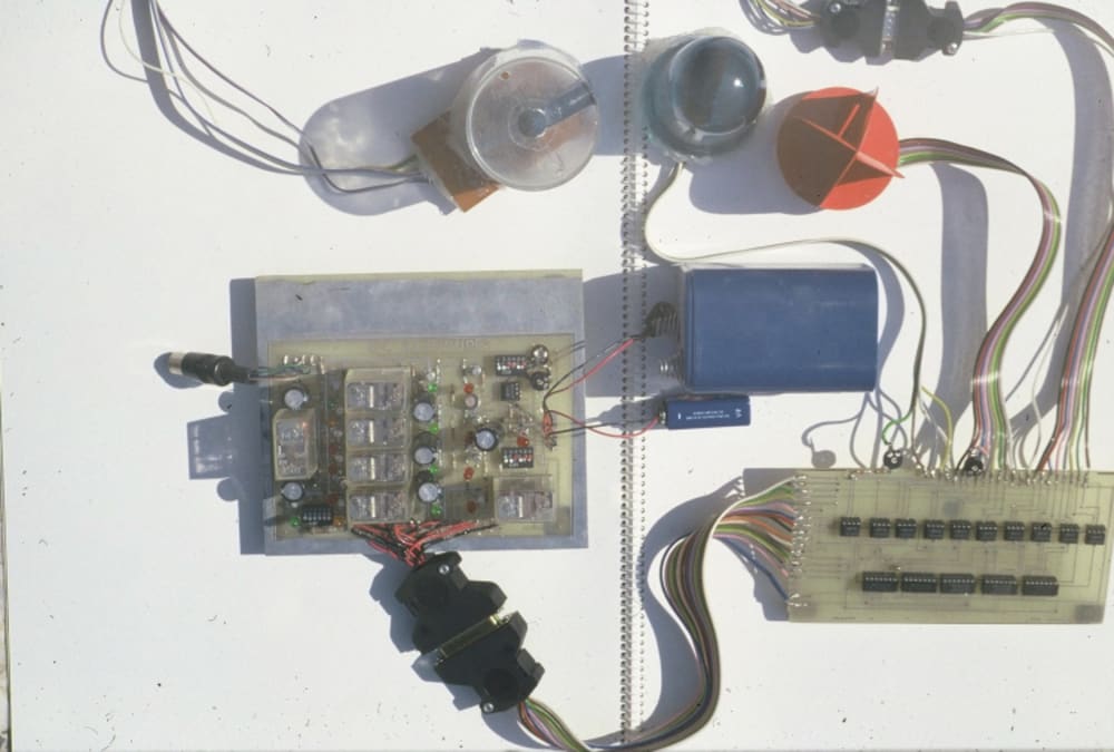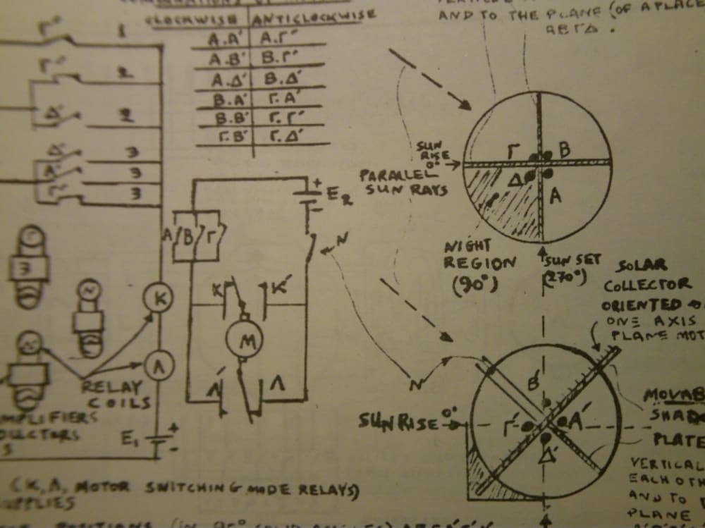 Similarly, the orientation of the tracker, with respect to the sun rays‘ direction is indicated by angles : ?’, B’, ?’ and ?’.This set of angles is constructed similarly with that of the “Fixed” ones but it “Rotates” in step with the vertical shaft AZIMUTHIALLY. Optical sensors within angles [four in each one – if A is set by light at logic level “1” then B, ? and ? are set to level “o”, unless equally lighted such as the case of STOP: ?’.?’] give signals, processed by the logic unit of the system. A table is drawn for the “BOOLEAN ALGEBRA” combinations for CLOCKWISE, ANTICLOCKWISE and STOP requirement conditions. The sets of combinations minimize to the following functions [“AND” functions]: