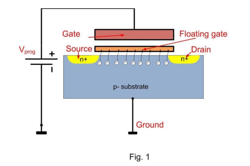 If the drain and source (terminal names of the FET) are connected to the ground and high voltage Vprog is applied at the gate (the third terminal) – a tunneling electron current flows and charges the floating gate (Fig.1). It can reach 10A/meter square density.