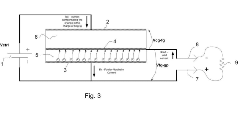 Let us when the voltage Vfg-gp reaches some desired value Vbat connect a resistive load 9 between the Injector and the Cathode. The resistance value R is set so, that the load current Iload=Vbat/R is equal to Ifn. Then all electrons tunneled from the Injector to the Cathode, will go in the load. The charge of the three capacitors will remain constant. Vbat will be also constant. The voltage Vcg-fg will as well. The current Igc will not flow. No power will be consumed from the high voltage battery, but energy will be dissipated in the load. It sounds like perpetual machine, but the trick is that before and after the tunneling the electrons have the same energy and no energy is needed from the external source.