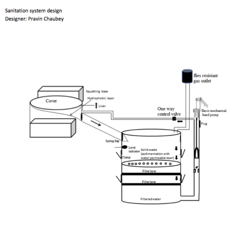 The proposed design is a semi closed system with a small quantity of water moving waste as well as eliminating pathogens . For risk minimization the earlier the treatment the better. Pathogens are known to die off at higher pH. So water getting circulated within the system is made alkaline by addition of readily available powdered lime or soda ash (more accessible/cheaper then chlorine). It also reduces odor. A pH of 9 or more for 24 hour period can make the solution un-habitable for viruses and bacteria. It is estimated that addition of lime once every two week will sustain the required pH in the system. About two teaspoons of lime per gallon of water can raise the pH to required levels, so 250 grams of lime mixed with 20 gallons of water would be taken as initial alkaline solution. It would not harm the system if a rough measurement is made (more practical). Gravitational sedimentation (being simple and cost effective) forms the first stage of solid waste separation (to reduce volume and weight). During second stage water permeates to lower chamber, leaving solid waste in upper chamber. Two layers of screen filter further separate the waste from the solution. The filtered water gets collected in the lowest chamber(see figure). Two level indicators indicate disposal time for solid and liquid waste. The user first hand pumps filtered water into the bowl before use. The same pump is also used for draining excess water out (through drain plug). Two spring loaded flaps seal odor from reaching the bowl. As the top (solid waste) chamber gets full, it is replaced by an empty one. The removed chamber is sun dried (in sealed condition).