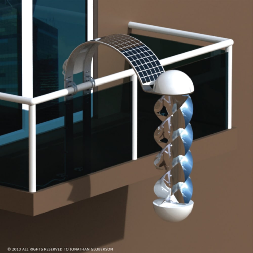 It is a compact solar and wind turbine that can be installed right on an apartment balcony. It looks a lot like an aerodynamic wind chime. It is equipped with a vertical axis wind turbine, which captures wind from all directions with less friction than a horizontal turbine. Its base is spinning on magnetic levitation, which loses less energy as a result of less friction compared to a ball bearing system. The flexible solar panels produce electricity from the sun’s radiation. This superior solar-wind hybrid allows harvesting more energy out of a single product.
