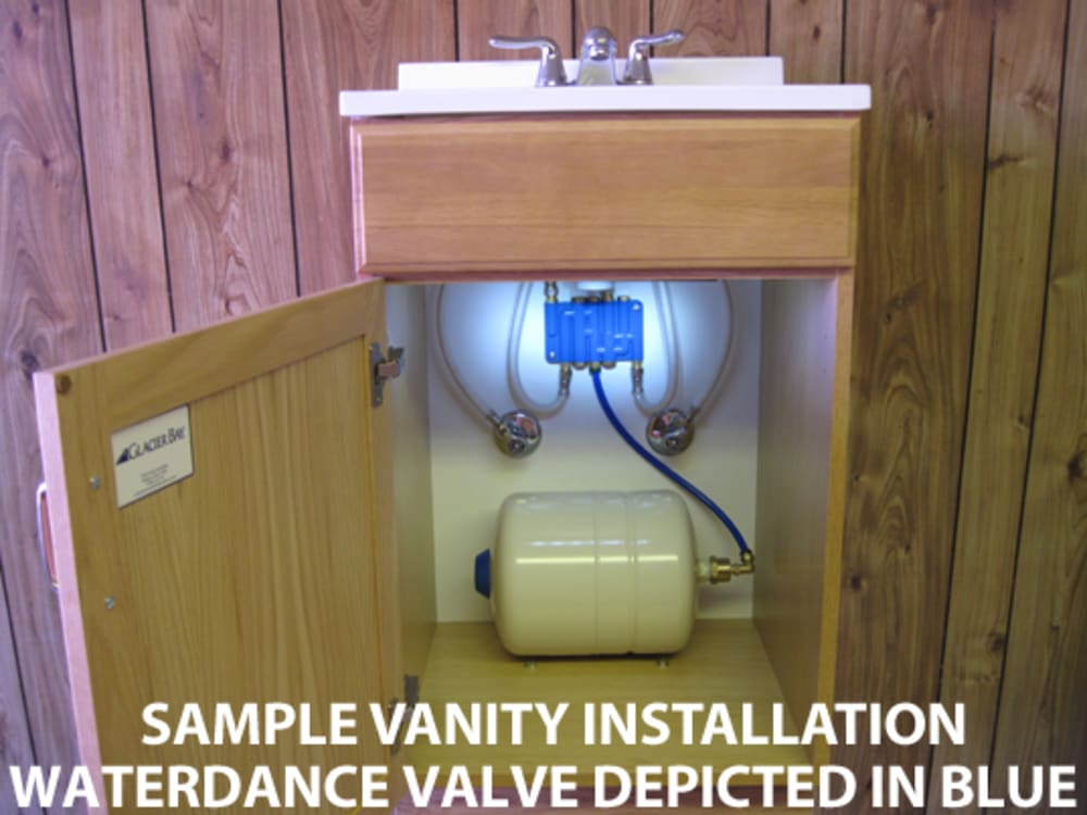 The Waterdance Valve is devised of water pathways used to determine the incoming water temperature and direct the flow according to a pre-determined temperature threshold. When the hot water faucet is opened (turned on), the Waterdance Valve directs the initial cold water stream (which is normally wasted) to an accumulator (pressurized storage tank) to be stored until cold water is needed. When the valve detects that the incoming water has reached the desired hot temperature, it redirects the water flow directly to the faucet and the user controls it normally by adjusting the faucet handle(s) as desired. In the case of a standard two-handled faucet, when the hot water is turned on by itself, no water will flow from the faucet until the water is hot (because that’s the cold water being saved). Water flow from the cold water faucet is always available and will come first from the accumulator, and then from the incoming city water. Any switch from a depleted accumulator to city water is unnoticeable by the end user. From an initial start-up cycle, hot water will begin flowing slightly sooner than it would in a traditional installation but varies from faucet to faucet depending on distance from the water heater.