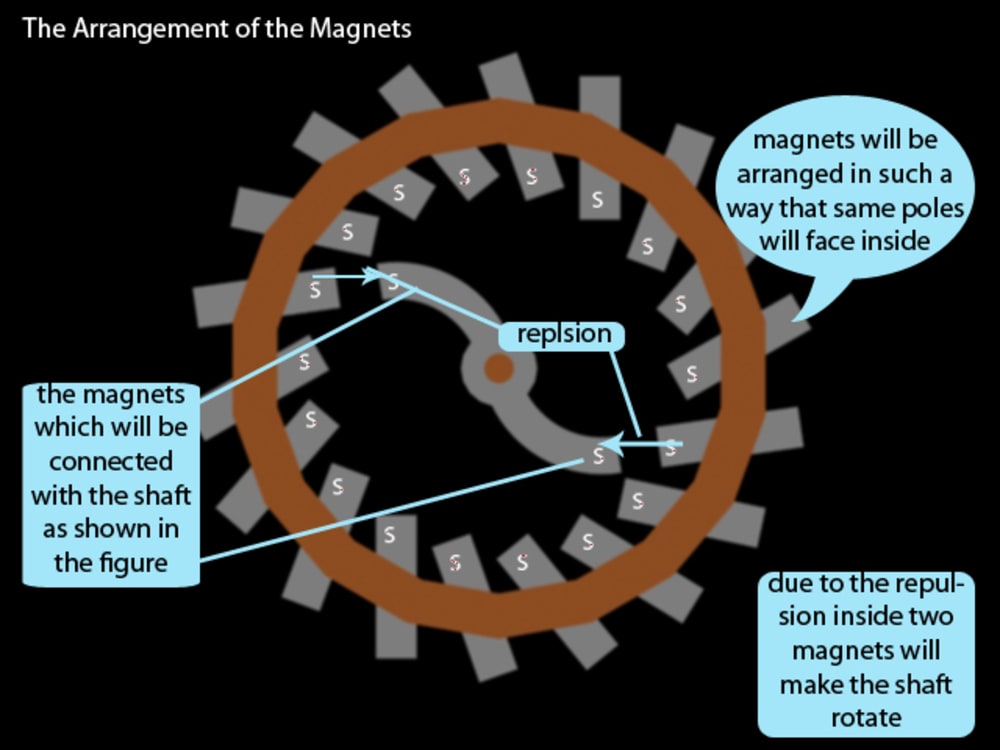 In this design we have to use strong magnets, as they will repel each other with large force and the no of the rotation of the shaft per second increase.