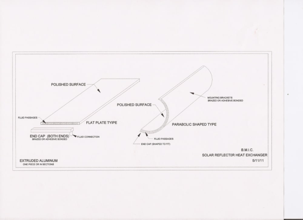 Concept #2. Design a reflector that consists of a series of extruded aluminum tubes. One side of the tube can be polished to produce a reflective surface. The ends of the aluminum extrusion, or seperate tubes, can be capped to produce a flow circuit through which the coolant can be directed. Since the extrusion is a single unit, the heat transfer can be more efficient. The flat plate can also be used as a water heater similar to present units.