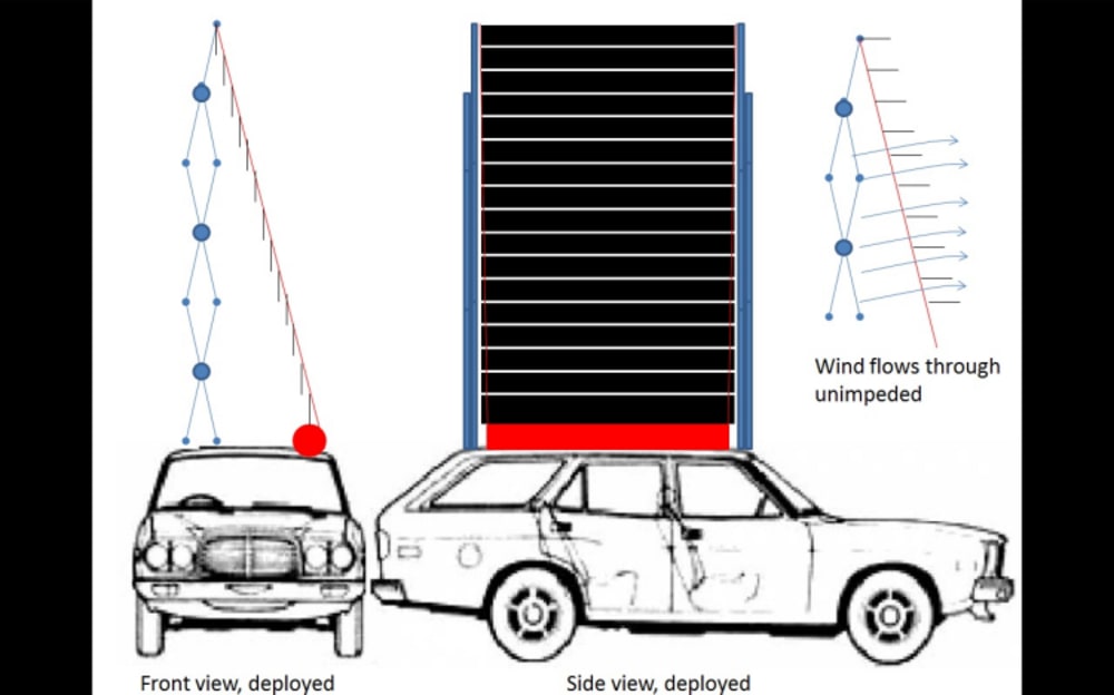 The solar panel is a deployable solar sail, as on satellites. It folds up when the car is traveling, but when parked the solar sail is deployed upwards to achieve a large surface area, much larger than the roof of the vehicle. Deploying the solar panel also provides a more favorable angle to the sunlight. The sail is extended primarily in an upward direction to avoid interference with surrounding vehicles and structures, and to allow it to be deployed in public parking lots.