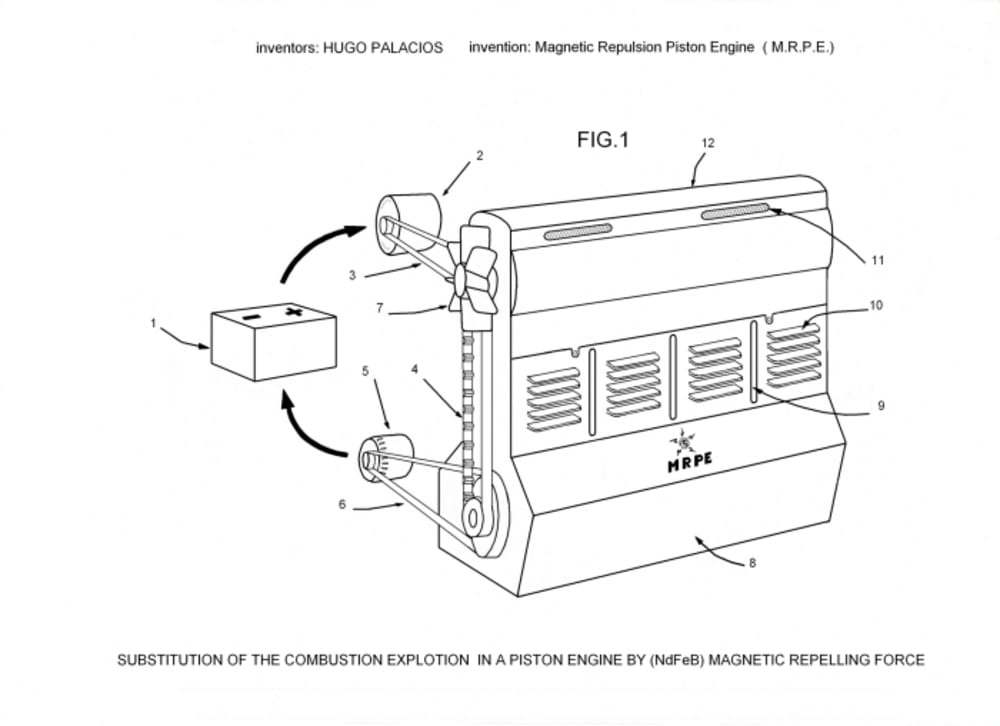 Reference character number 1 is the 12 volt battery. Reference character number 2 is the Start/Speed motor. Reference character number 3 is the driving belt that spins the magnetic drum.Reference character number 4 is the timing belt that spins and causes the north face polarity magnets in the drum to align with the north face polarity magnets on the piston heads to create repulsion/momentum. Reference character number 5 is the alternator that charges the battery. Reference character number 6 is the driving belt that spins the alternator. Reference character number 7 is the air coolant fan that cools down the magnets. Reference character number 8 is the engine monoblock. Reference character number 9 is air coolant channels between cylinders. Reference character number 10 is coolant strips that cool down the cylinders.Reference character number 11 is the air ventilators that cool down the magnetic drums. Reference character number 12 is the safety guard that protects the spinning drum from outside interference, i.e., dust, metal particles, rocks and/or human errors. Reference character number 13 is the magnetic flux. Reference character number 14 is the opening that exposes the magnetic flux.