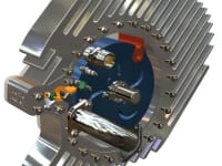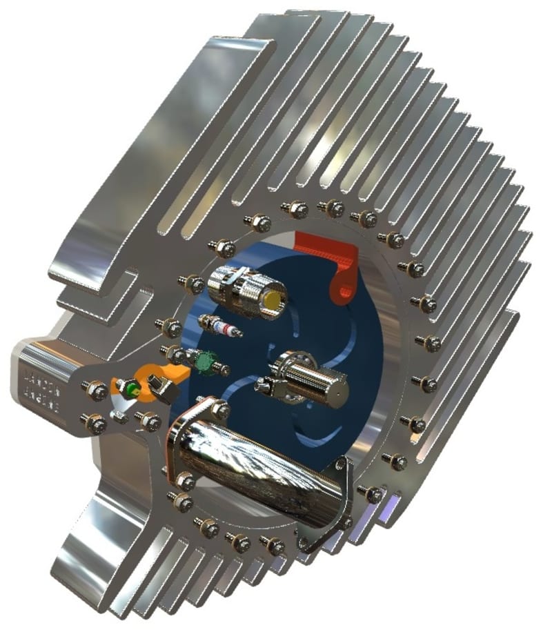 Invented by Peter Landin. It has only three moving parts, and may be the engine of the future. The moving parts: a rotor (in blue), an orbital swivel valve (in red), and a stationary swivel valve (in yellow), form a variable combustion chamber. As this chamber increases its capacity, it generates a vacuum and suctions a mass of air through the intake check valve. Direct injected fuel mixes with this air mass to form a combustible atmosphere. When ignited, the combustion closes the intake check valve instantaneously and forces the orbital swivel valve and rotor to rotate as one piece, transferring a high-power, high-torque rotation. This unique design allows heat dissipation through an aluminum jacket that fits around the engine. The heat-dissipating element wraps around the engine housing and can be of different designs, maximizing the engine’s versatility for a wide range of applications. This engine can be air-cooled or water-cooled, depending on the heat-dissipating element design used.