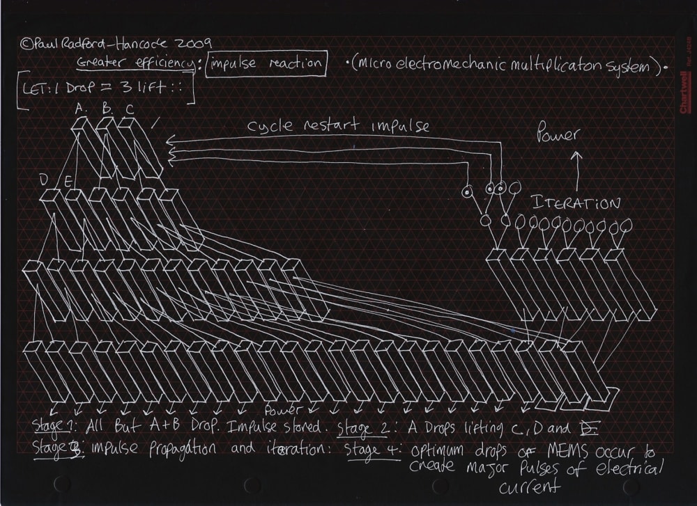 The mechanistic recuperation of gravitational force and the transformation of that force into electrical current is based on a simplistic corollary to Newton’s third law; that every action has an equal and opposite reaction. In the case of the Micro-Efficient Electro-mechanical multiplied-system self-sustaining reaction, this corollary is achieved materially and is as follows: If an action requires a specific amount of force to achieve, then by giving the resultant reaction a shortcut allows more work to be done by the same amount of force.