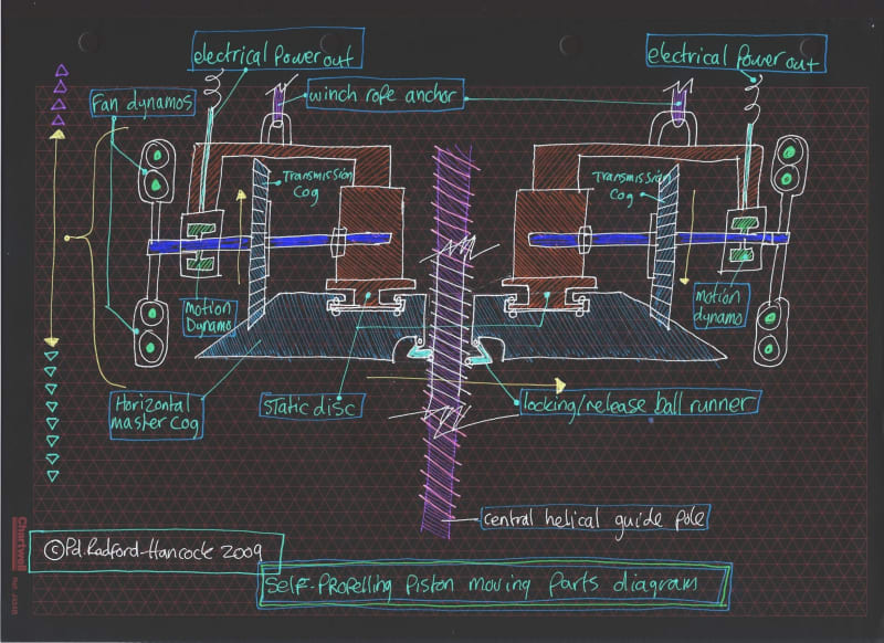 So it is that when a fan dynamo assembly is moved by the force of gravity around a spiral track, traveling vertically downwards while completing many revolutions around its vertical axis on its journey, it produces a certain measurable quantifiable and constant amount of electrical power. The premise of the self sustaining reaction is that this amount of power can, in certain material/mechanical physical propositions, be enough to return such an assembly to its starting position, because the assembly runs downwards on hinged sprung catches, which are locked in position on the runner grooves when weight rests on them, and retract when the assembly moves upwards, allowing the assembly to travel in a STRAIGHT LINE vertically upwards. This is in effect the basis of the Newtonian shortcut, that work performed because of the natural action of gravity or centrifugal force upon the assembly is EQUAL OR GREATER in terms of its electricity output to the electricity required to return a neighboring identical assembly to its starting position where Gravity is able to act upon it and reproduce an identical amount of electricity.