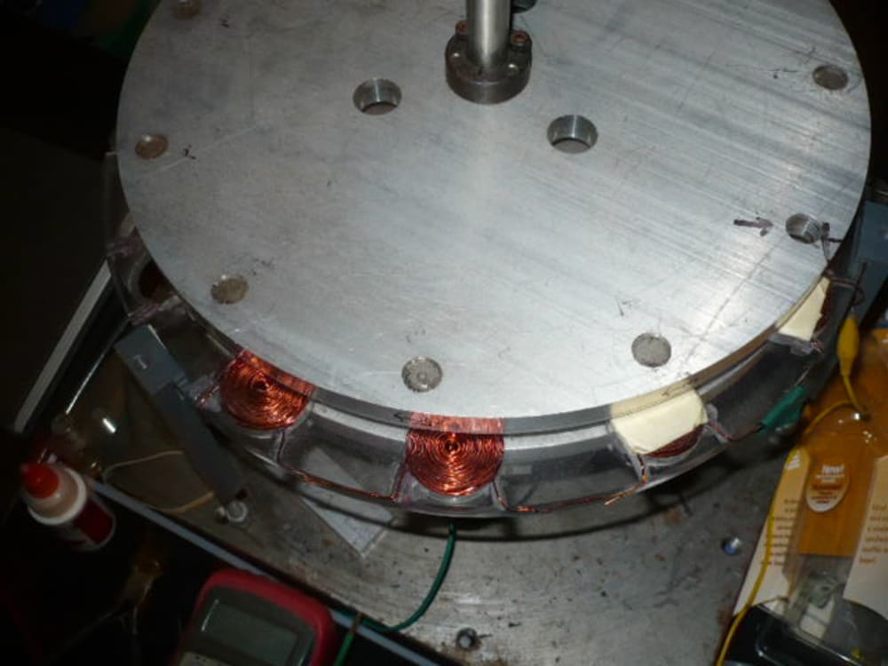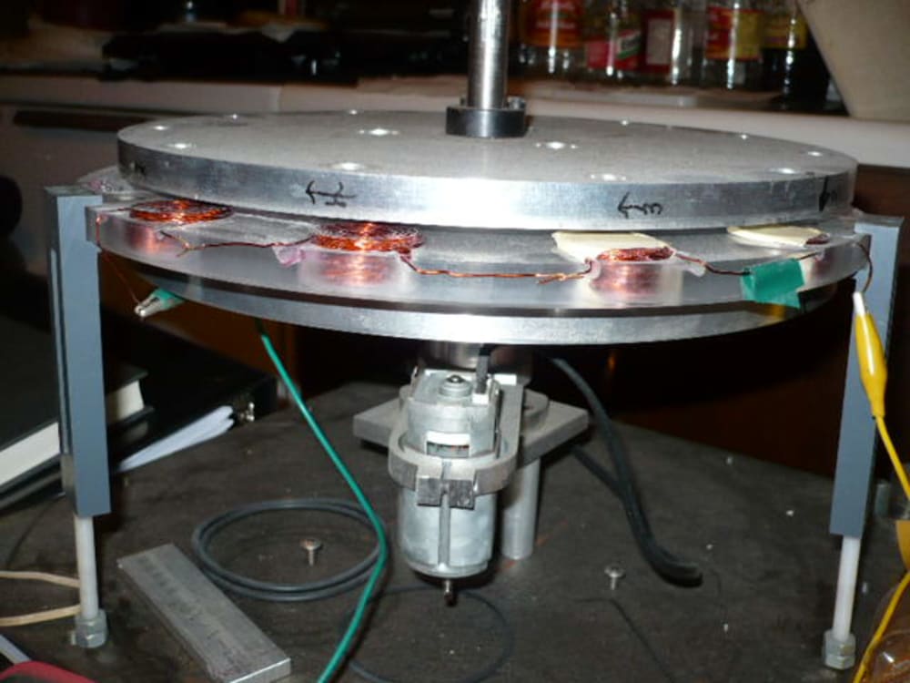 The Energy/Power system is an Axial Flux Generator, which is driven by a DC Brushless Motor, intermittently pulsed and running at high rpm's. The rotors are spun as a flywheel by the motor and are embedded with neodymium magnets that pass over copper windings, and produce electron flow through the coils. There have been additional modifications to the system in the form of magnetic bearings for increased performance and the addition of microchannel plates for electron multiplication.