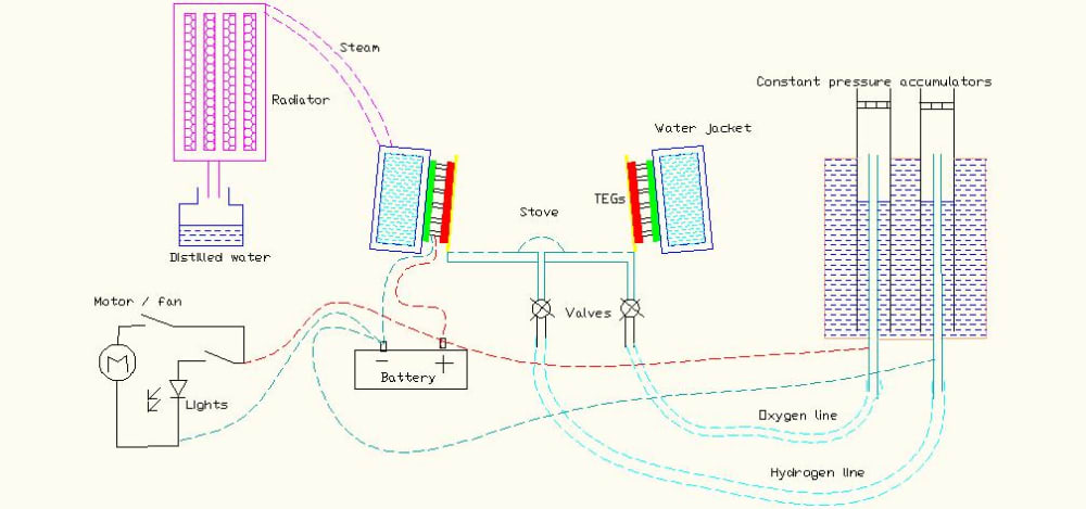 Heat passing through TEGs boils water in the water jacket and produces steam. This steam is condensed using a radiator to produce distilled water, which can be used in many applications.