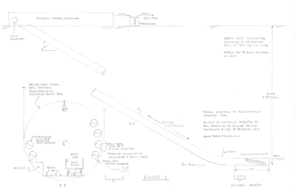 The use of a Tunnel Boring Machine (TBM) will be used to create a 7 meter (~23 Ft.) diameter tunnel, angled at 30 degrees, to a depth of 16 Km (9.9 miles). At this depth, the heat from the earth will be approximately 400 C to 480 C (752F to 896F). Total tunnel length will be 27.7 Km (17.1 Miles). Existing technology and experience is available to construct this tunnel. Construction and operation below two (2) Km will be performed tele-robotically and through the use of spacesuit like protection. The use of a tunnel with a 30 degree incline allows the tunnel wall and steel liner to support the weight of all the equipment and also permits human and machine travel along the tunnel’s length.