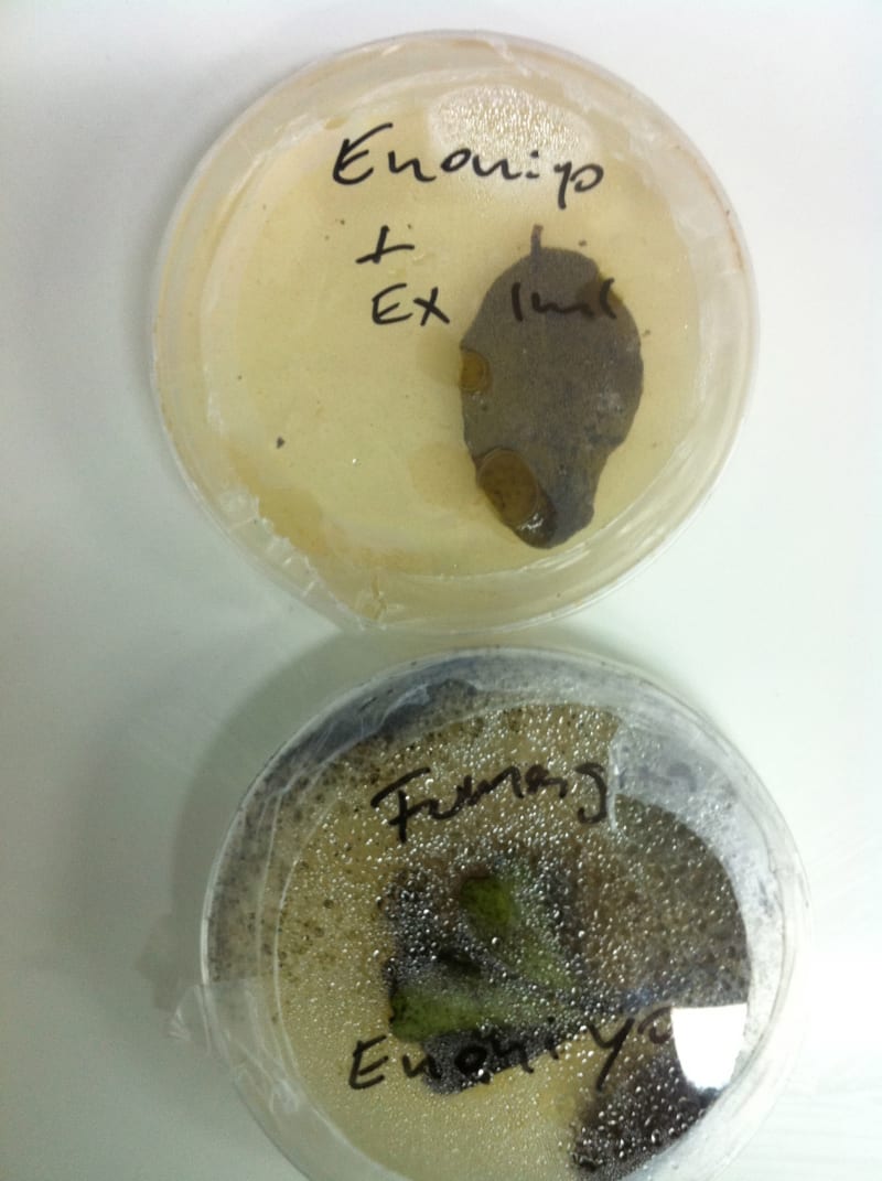 Our enterprise is developing a commercial solution (patent pending) made from extracts of different kind of nuts that can prevent a wide spectrum of fungi from growing on the applied surfaces. The attached images show the effectiveness of the product in its testing stage. Bottom image shows normal fungi growth on a PDA agar (red circles), top image shows no growth whatsoever on the agar due to addition of our product.
