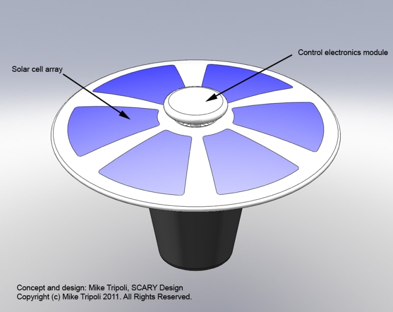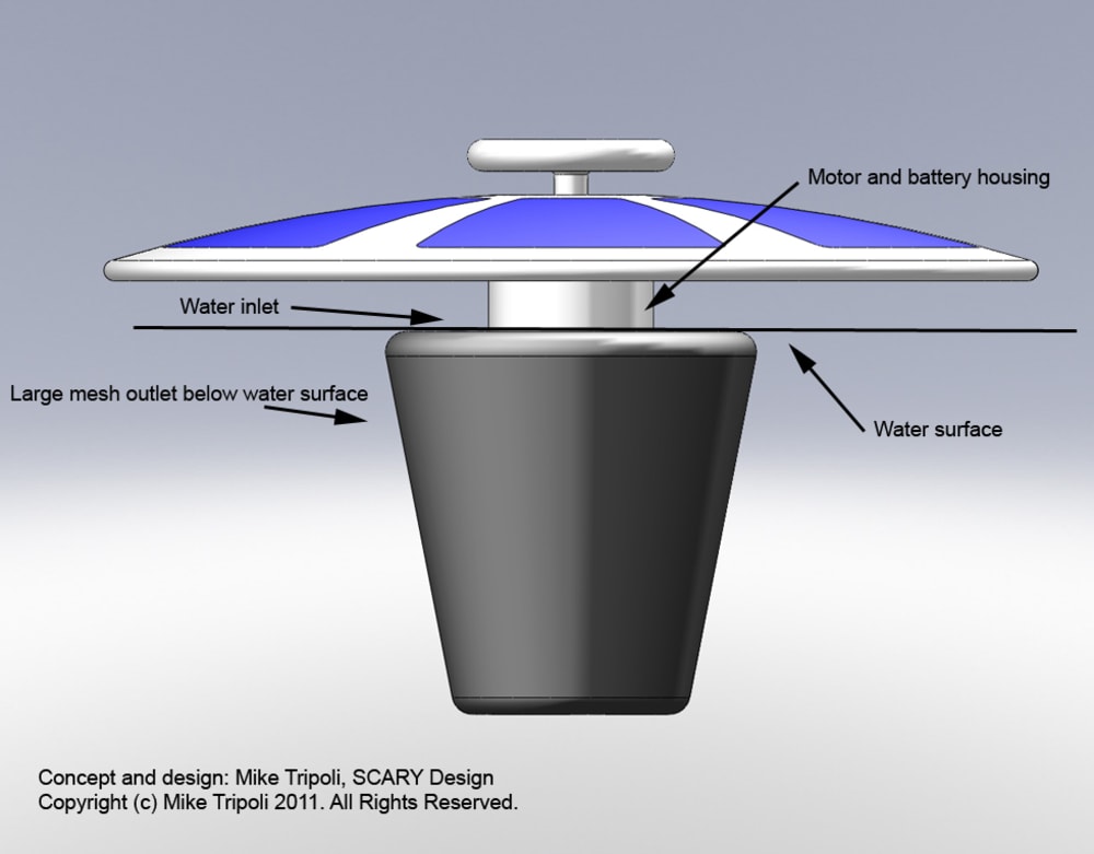 The unit contains a solar cell array arranged around the surface of the unit. Internal to the unit is a completely sealed rechargeable battery and associated charging and conditioning circuitry along with a low-power microcontroller. Simple sensors only allow the unit to run only when it is in the water and timers run the motor in cycles.